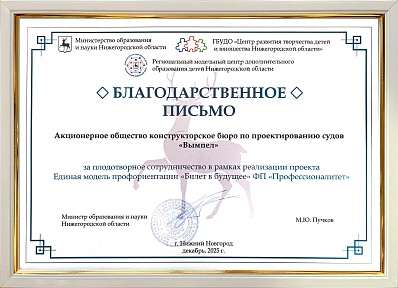КБ ОСК «Вымпел» удостоено благодарственным письмом Министерства образования и науки Нижегородской области за вклад в проект «Билет в будущее»